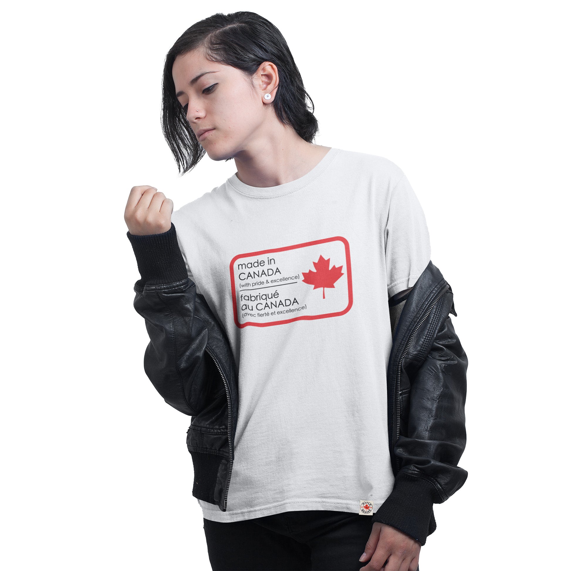 This Made in Canada T-shirt features a bold bilingual label design that proudly reads “Made in Canada (with pride & excellence)” and “Fabriqué au Canada (Avec fierté et excellence)”. Designed in the style of the 'Made in Canada' label, it serves as a quiet yet confident reflection of what we stand for.