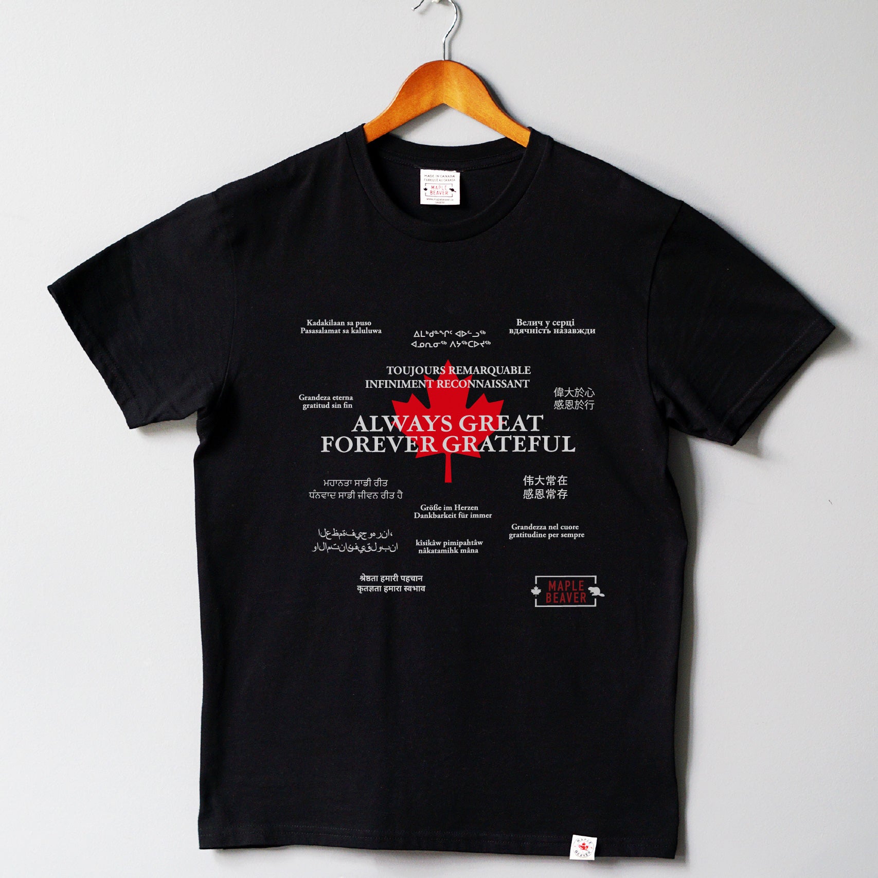 The Maple Beaver Unity Tee features the words Always Great, Forever Grateful expressed in 14 Canadian languages, from Inuktitut to Punjabi, Tagalog to French, reminding us of the diversity that strengthens our national spirit.